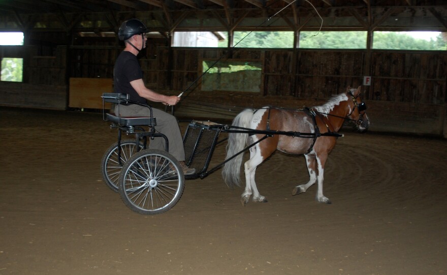 With me holding the reins long and soft, my Shetland pony pulls me along in a cart. We work on cadence, trot, and turns. The arc of her neck and impulsion from her hindquarters are my focus.
