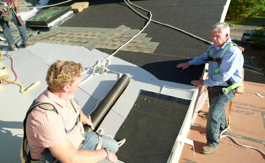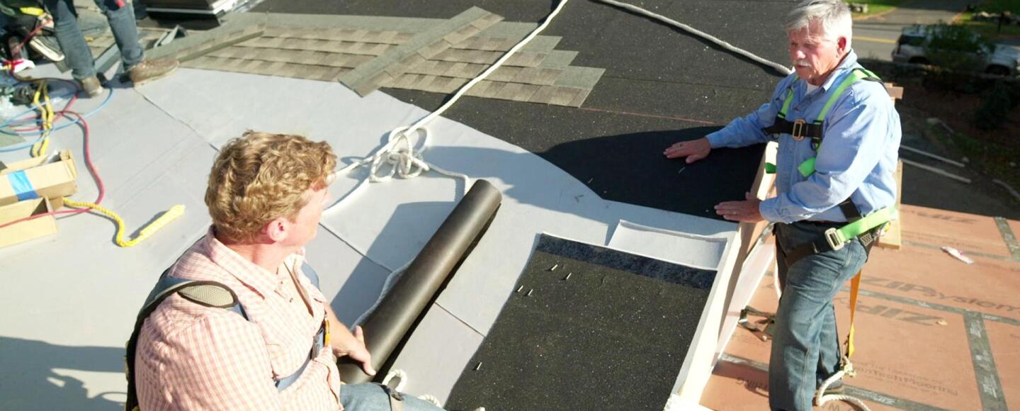 Tom Silva talks about the different types of underlayment used for the roof. Charlie Silva, Kevin O'Connor, and Mark McCullough install an oak mantle. Mark corrects problems with the fireplace brickwork. Richard Trethewey and plumber Abe Bilo disassemble the old boiler to be replaced with a new wall-mounted boiler. Mauro Henrique paints the exterior clapboards inside. A linear drain is installed.