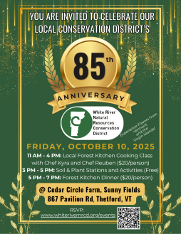 The White River Natural Resources Conservation District (NRCD) invites the community to join in celebrating its 85th Anniversary on Friday, October 10th, at Cedar Circle Farm’s Sunny Fields Farmhouse in Thetford. Established in 1940, the White River NRCD has been working for generations to serve Vermont’s wild and working lands, waterways, and wildlife habitats through partnerships, technical assistance, education, and community-led initiatives.