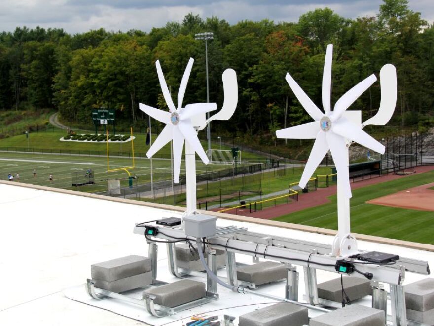 Castleton College built its newest dormitory, Hoff Hall, with solar panels on the roof. Now, four new micro wind turbines will be generating power alongside them.