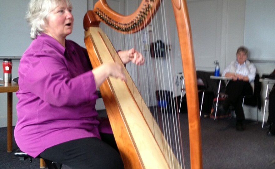 After students settled into their seats on a sunny, crisp afternoon, Schneck stood beside her harp in the middle of the classroom and explained her unusual line of work. She said she is not trying to cure serious illness, but she cited clinical studies showing that certain kinds of music—especially harp--can change the body’s response to pain and stress.