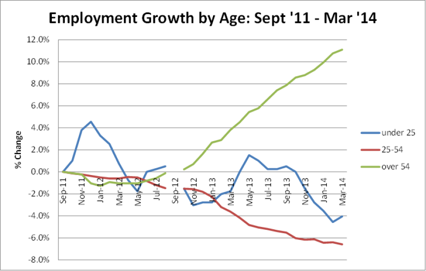 This article in The Economist includes a chart showing nationwide job trends for the same age groups over roughly the same period of time.